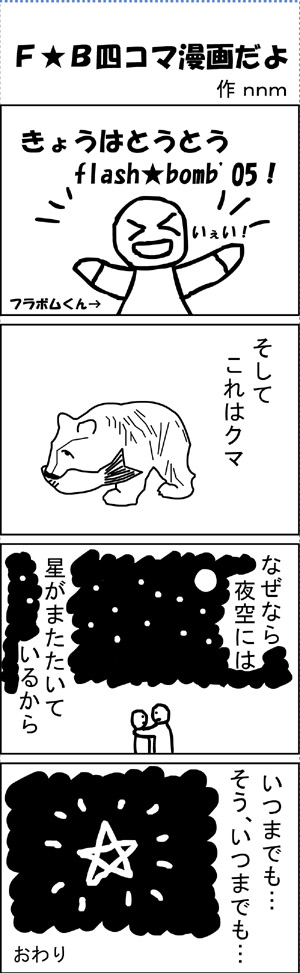 らー。そういえばslashup02というオフラインイベントに出ていいらしいのでなにか新しくFlash作って出すような気がしないでもないし出すんじゃないかなとも思いますがだからと言って東京会場に足を運ぼうかなと思っています。全国でやるらしくて八月とかまであるらしいのでそれに提出するFlashのこのサイトでの公開は八月になるのかな。よくわかりません。なります。でもそのときぼくは思ったんだ。あの遥かなる空の向こうにはあと映夜祭'06というオフラインイベントに応募したら出ていいよって言われたのでなにか新しくFlash作って出せばいいと思います。こちらに出すFlashは七月中にサイトで公開できると思います。しかし世の中何があるかわかりません。こっちの会場にもふらふら行きます。なにもありません。とりあえずなんか去年flash★bomb'05というイベントに出たときに会場で配られた冊子に寄稿した四コママンガでも置いておきます。ばいばーい。あとサイト三周年です。おめでとうございます。